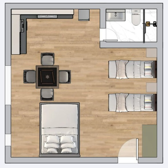 Apartamentul are o suprafata de 36 de metri patrati si poate caza pana la 4 persoane. Apartamentul are un pat dublu si doua paturi single.