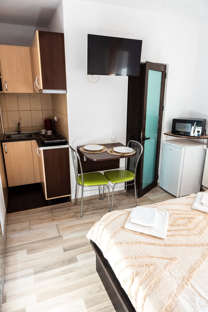 Tip: Apartament cu o camera Descriere: Apartamentul are o suprafata de 15 metri patrati poate caza 2 persoane. Facilitati apartament: - Frigider - Plita bucatarie - Vesela - Cuptor cu microunde - Internet WiFi - TV LED - Seif